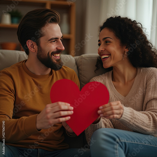 Romantic Couple Embracing with Red Glitter Heart Love on a Special Day, Concept Holiday Romance