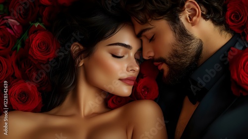 Romantic couple in tender embrace against red roses background. Young woman with closed eyes and bearded man in black suit share intimate moment in dramatic lighting.