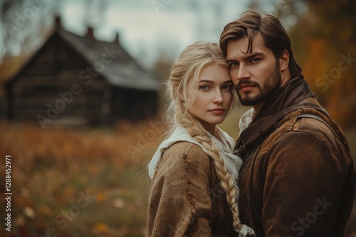 Romantic couple in vintage clothing standing together near a rustic cabin in autumn scenery