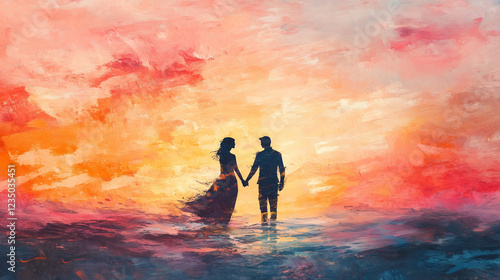 love, valentine, romance, couple, february 14, valentine, beach, sunset, ocean, sea, wave, holding hands, colourful, sky, dramatic, cloud, silhouette, dress, painting, style, impressionism, sun, woman, water, summer, sunrise, illustration, people, nature, vacation, tropical, beauty, person, palm, evening, wave, sand, coast, family, travel, walk, landscape, cloud, walking, orange