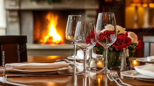 table, dinner, fireplace, wine, goggles, napkin, rose, red, white, romantic, candle, setting, love, warm, glow, elegant, ambience, cosy, interior, design, decor, floral, bouquet, dining, room, eatery, wooden, tabletop, place, glassware, silverware, gold, fire, light, wood, beautiful, home, lifestyle
