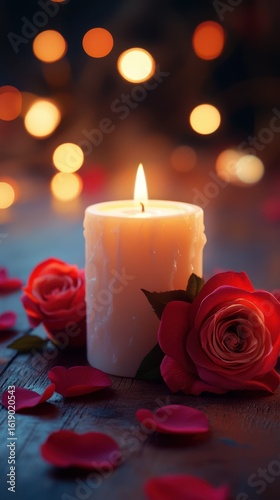 Romantic evening with a lit candle and red roses on a wooden table adorned with rose petals