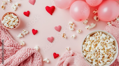 Romantic Flat Lay Arrangement with Popcorn, Balloons, Hearts and Soft Knitted Blanket on Light Pink Background for Celebration and Enjoyment