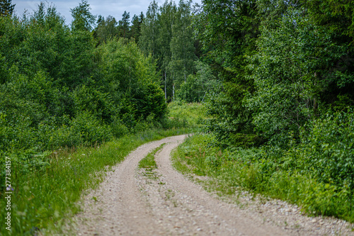 romantic gravel dirt road in countryside in summer green evening