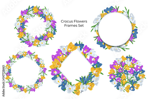 Romantic hand drawn crocus flowers wreaths set. Floral frames. Stock vector illustration.