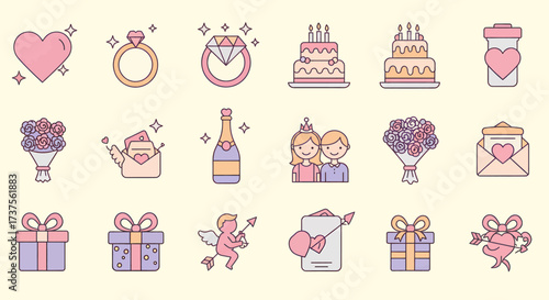 love, romance, wedding, february 14, nubes, ring, diamond, cake, bouquet, champaign, couple, gift, cupid, letter, icon, symbol, design, illustration, graphic, element, clip art, vector, flat, line art, cute, sweet, romantic, celebration, anniversary, marriage, human relationships, affection, passion, commitment, togetherness, happiness, joy