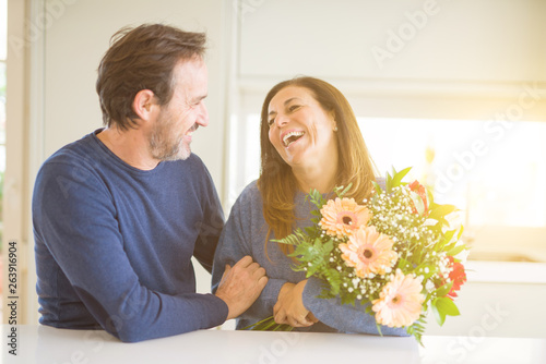 Romantic middle age couple holding flowers in love at home