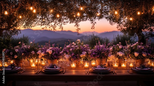 sunset, romantic, dinner, party, flower, candle, table, mountain, landscape, evening, night, view, scenic, beautiful, elegant, rustic, charming, idylli, serene, peaceful, tranquil, magical, whimsical, cosy, intimate, celebration, gathering, feast, event, occasion, ambience, atmosphere, lighting, decoration, arrangement, floral, purple, white, terracotta, wood, long, summer, spring, autumn, fall, warm, light, joy