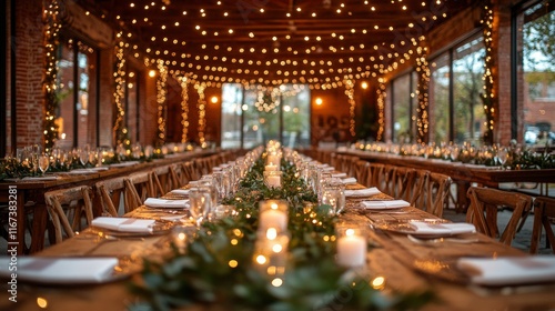 wedding, reception, venue, rustic, romantic, lichterkette, candle, greenery, garland, table setting, chair, banquet, event, celebration, party, elegant, charming, ambience, atmosphere, indoor, farmhouse, industrial, brick, window, natural light, flower, leaf, festive, dinner, feast, decor, decoration, beautiful, magical