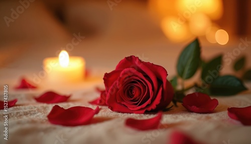 Romantic scene with red rose petals scattered, candle flame on bed. Soft light, sensual atmosphere. Intimate mood creates romantic evening, relaxing, calming ambiance for Valentine Day, or dating.