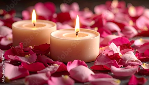 Romantic scene with two burning candles on a bed of fresh pink rose petals.