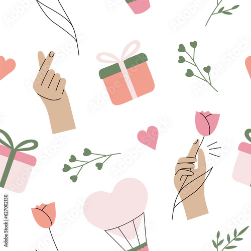 seamless, pattern, cardboard box, gift, love, give, cute, flower, pink, green, hand, nubes, gesture, white, balloon, wedding, friendship, wallpaper, tulip, botanical, stationary, design, box, notebook, wrapping, cover, present, modern, paper, decoration, pretty, romantic, print