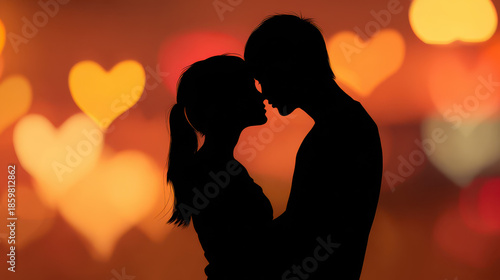 Romantic Silhouette of a Loving Couple Embracing Amidst Heart-Shaped Bokeh for Valentine's Day Celebration