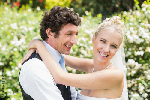Romantic smiling newlywed couple hugging each other