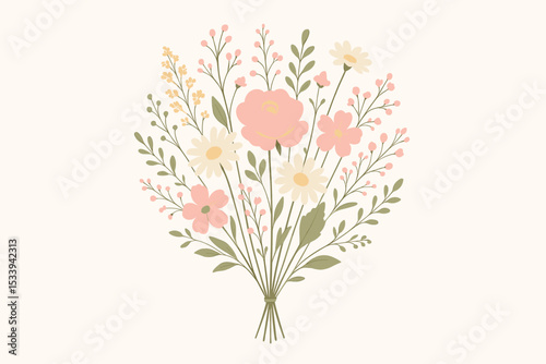 Romantic spring bouquet with delicate pink roses, daisies and wildflowers. Vector floral illustration for wedding invitation, greeting card, or Mother's Day design. Pastel color palette.