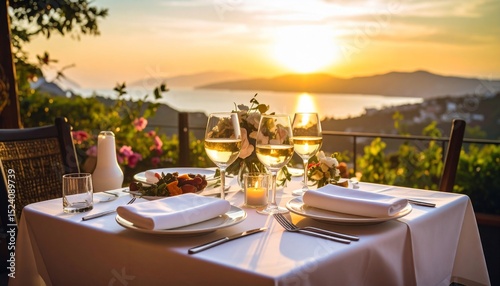 sunset, ocean, dinner, romantic, view, table, wine, sea, coast, landscape, epicure, food, eatery, white, tablecloth, goggles, plate, flower, candle, evening, gold, luxury, elegant, beautiful, serene, peaceful, calm, relaxing, horizon, summer, warm, gold, ambience, delightful, cosy, hill, terrace, outside, balcony