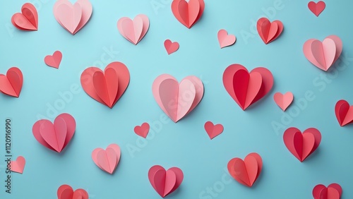 Romantic Valentine's Day Background, Pastel Pink & Red Paper Hearts on Blue