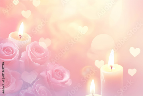 Romantic Valentine's Day background with pink roses and lit candles, soft bokeh hearts. Perfect for cards, websites, or social media.