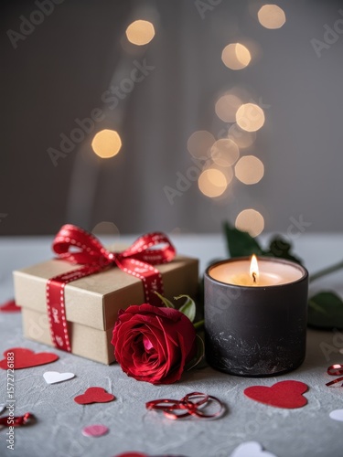Romantic Valentine's Day gift scene: candle, rose, and present.