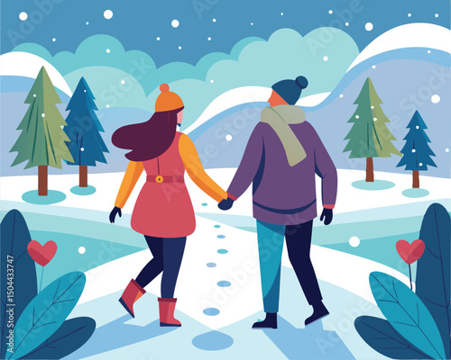 Romantic Winter Walk. Couple Holding Hands in Snowy Landscape