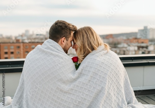 romantic, couple, young, red, rose, valentine, day, caucasian, rooftop, embracing, love, blanket, outdoors, urban, city landscape, winter, warmth, togetherness, affection, tenderness, intimacy, human relationships, connection, cosy, skyline, evening, calm, peaceful, serene, bonding, closeness, shared, moment, romanticism, companionship, partnership, hugs, cuddle, harmony, male, female, happiness, contentment, together, relaxed, metropolitan, panoramic