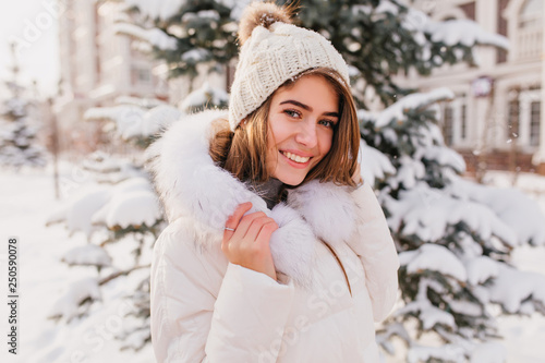 Romantic young woman in trendy knitted hat posing with smile standing near christmas snowy tree. Outdoor photo of laughing european woman wears ring walking down the street in winter day.