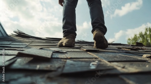 Roofer inspecting roof damage at a construction site. Featuring attention to detail and focus
