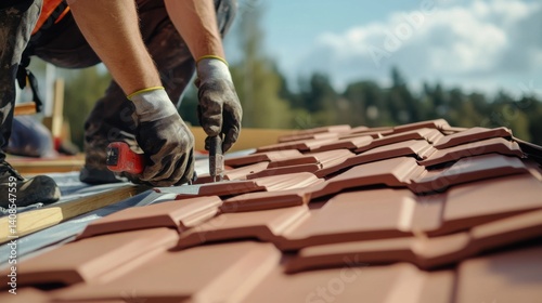 Roofer installing roof tiles at a construction site. Featuring skill and precision