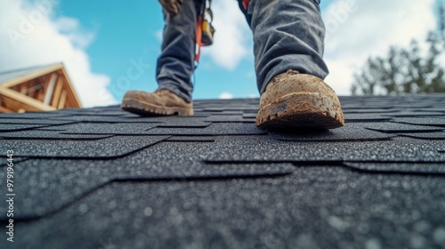Roofer worker installing asphalt shingle on new residential roof under construction. close-up photo. low angel shot photo.