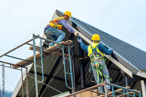 roof, metal, commercial, construction, inspection, roofer, house, improvement, industry, installation, renovation, tiling, work, men at work, drill, electric, maintenance, engineer, architect, equipment, roofing, build, finishing, safety, working man, builder, hard hat, scaffolding, harness, sheet, contractor, helmet, standard, home, street, covering, installing, structure, dangerous, labor, labourer, team, supervision, uniform, wear, construction site