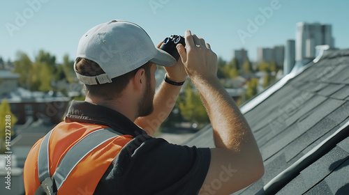 roofing, contractor, inspecting, roof, damage, safety, assessment, inspection, service, optical, men at work, binocular, visible, shingle, clear