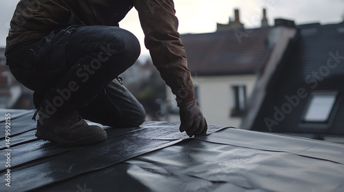 Roofing Worker Installing Shingles on a Building