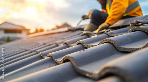roofing, men at work, tile, installation, sunset, construction, roof, house, safety-gear, building