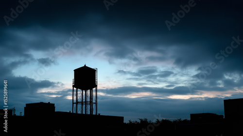 Rooftop water tower at dusk silhouetted against sky, soft light, quiet evening theme, moody style