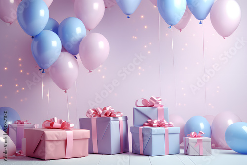 Room full of gifts and balloons. Celebration, holiday, birthday party