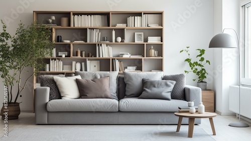 room, grey, couch, illustration, living, cosy, focal, point, plush, cushion, shades, harmonious, inviting, atmosphere, natural, light, texture, hot drink, table, vase, flower, stack, book, elegant, sophisticated, space, background, decor, interior, design, comfortable