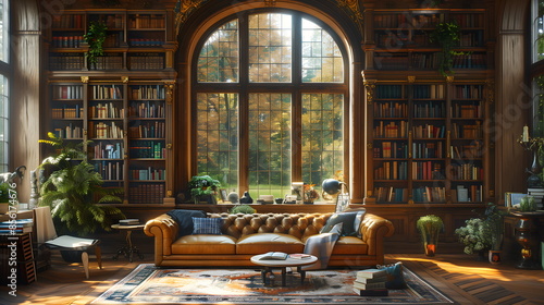 Room with bookshelves books and plants furnished with sofa carpet and round window Ai generated