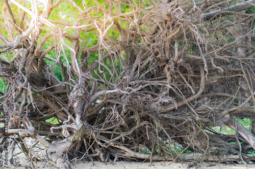 root of the big tree which big trunk fall down on sand sea ground after strong wind monsoon strom season.