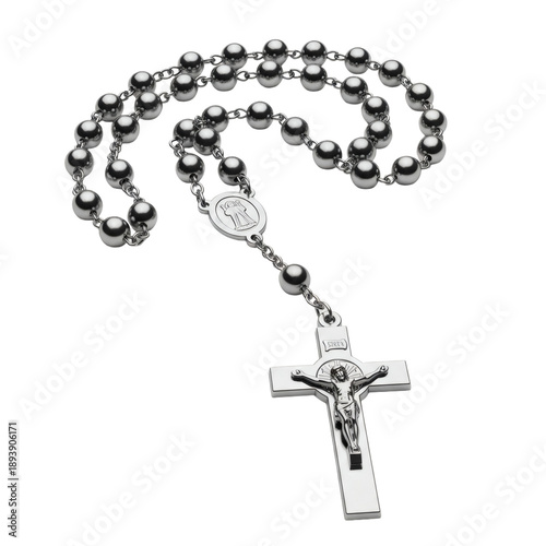 Rosary hanging in gentle curve with metallic crucifix reflecting light, Isolated on White background, on Wednesday Ashes