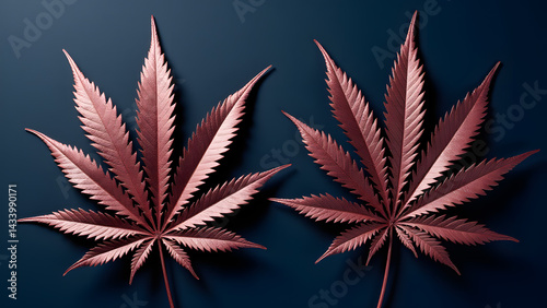 Rose bronze cannabis leaves on navy. Warm pink metallic sheen meets classic navy for timeless elegance.