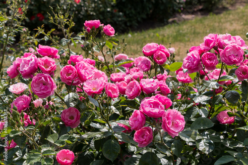 rose bush, pink, fresh beautiful bush roses on a summer day in the botanical garden