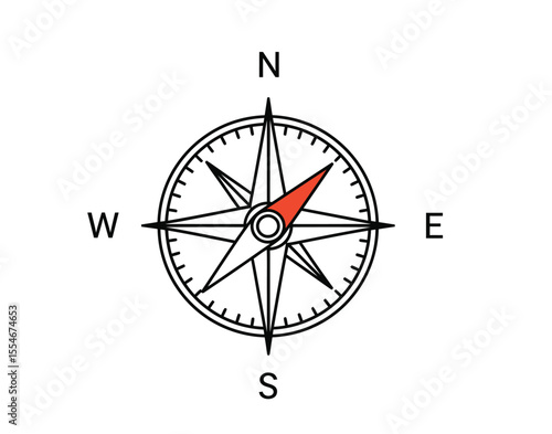 Rose compass drawing. It is a black and white outline image of a compass rose with a red needle, used for navigation and direction. Vector sketch line art draw.