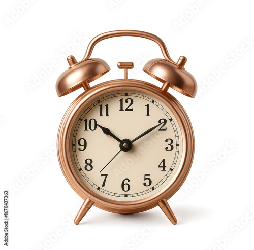 clock, alarm, time, twin, bell, copper, rose, gold, metal, analog, hand, number, face, minute, hours, second, beige, white, black, background, studio, shot, product, photo, home, decor, interior, design, vintage, retro, classic, style, object, still, life, morning, arousing, up, schedule, appointment, day, night