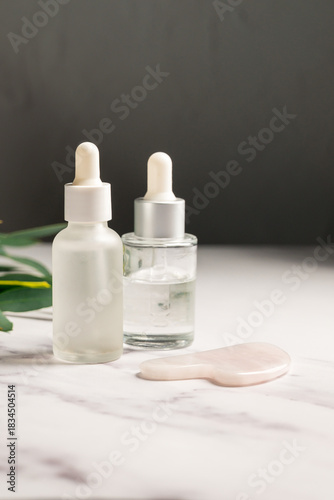Rose quartz gua sha and oil bottles, abstract beauty photo