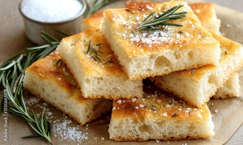 Rosemary focaccia bread, rustic kitchen setting