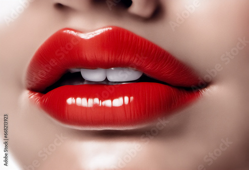 Rossetto rosso brillante in primo piano, labbra femminili