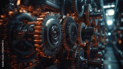 Rotating gears in factory, industrial background, complex mechanism, engineering