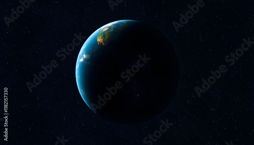Rotating planet earth in space. Half of the planet is illuminated, on the dark side there is light from houses. Starry sky. The concept of changing day and night, pop art, with white tones