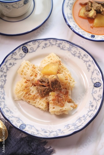Roti Jala or Lace pancake is Indonesian traditional food served with curry dishes