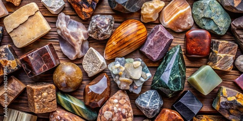 Rough-hewn stones, woods, and minerals, artfully arranged in a geometric pattern, convey a sense of lush natural